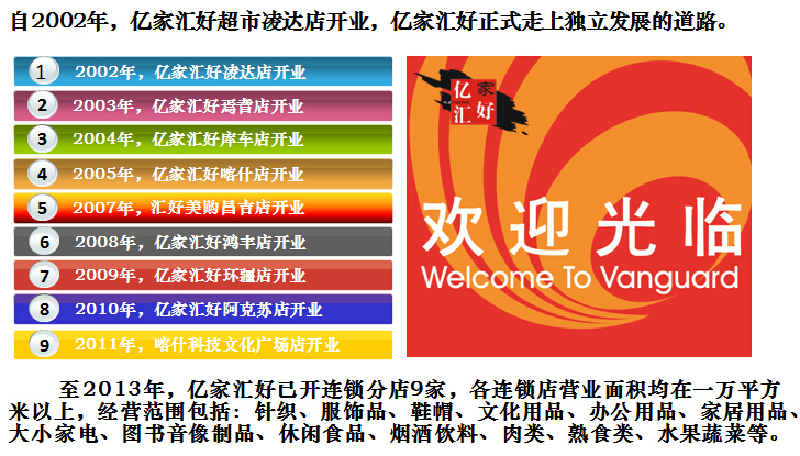 億家匯好商貿(mào)有限責(zé)任公司于2002年成立,并從臺(tái)灣引進(jìn)連鎖經(jīng)營(yíng)職業(yè)管理團(tuán)隊(duì),統(tǒng)一管理旗下各地的連鎖超市。公司通過(guò)多年的穩(wěn)健發(fā)展,至2013年底,億家匯好商貿(mào)有限責(zé)任公司已成為擁有員工近3000多人,下轄一個(gè)配送中心和9家連鎖超市的大型綜合性零售企業(yè)。總經(jīng)營(yíng)面積11萬(wàn)多平方米,配送中心輻射公司所有超市,年配送額可達(dá)2億元。公司大量吸納下崗職工,經(jīng)過(guò)崗前培訓(xùn),提高勞動(dòng)技能,實(shí)現(xiàn)了他們的再就業(yè),為維護(hù)社會(huì)和諧穩(wěn)定做出了貢獻(xiàn)。2013年,巴州億家匯好商貿(mào)有限責(zé)任公司在自治區(qū)零售業(yè)中穩(wěn)踞前三位,是自治區(qū)重要的流通龍頭企業(yè),2013年年銷售收入達(dá)10億人民幣。多年來(lái),公司一直重管理、抓實(shí)效、運(yùn)用先進(jìn)的管理手段和營(yíng)銷理念,秉承億家匯好人 時(shí)時(shí)尋求效率創(chuàng)新,事事講究專業(yè)技術(shù)的文化精髓,創(chuàng)造了良好的經(jīng)濟(jì)效益和社會(huì)效益。公司先后多次被消費(fèi)者協(xié)會(huì)評(píng)為誠(chéng)信單位,并多年被評(píng)為重合同,守信用單位。